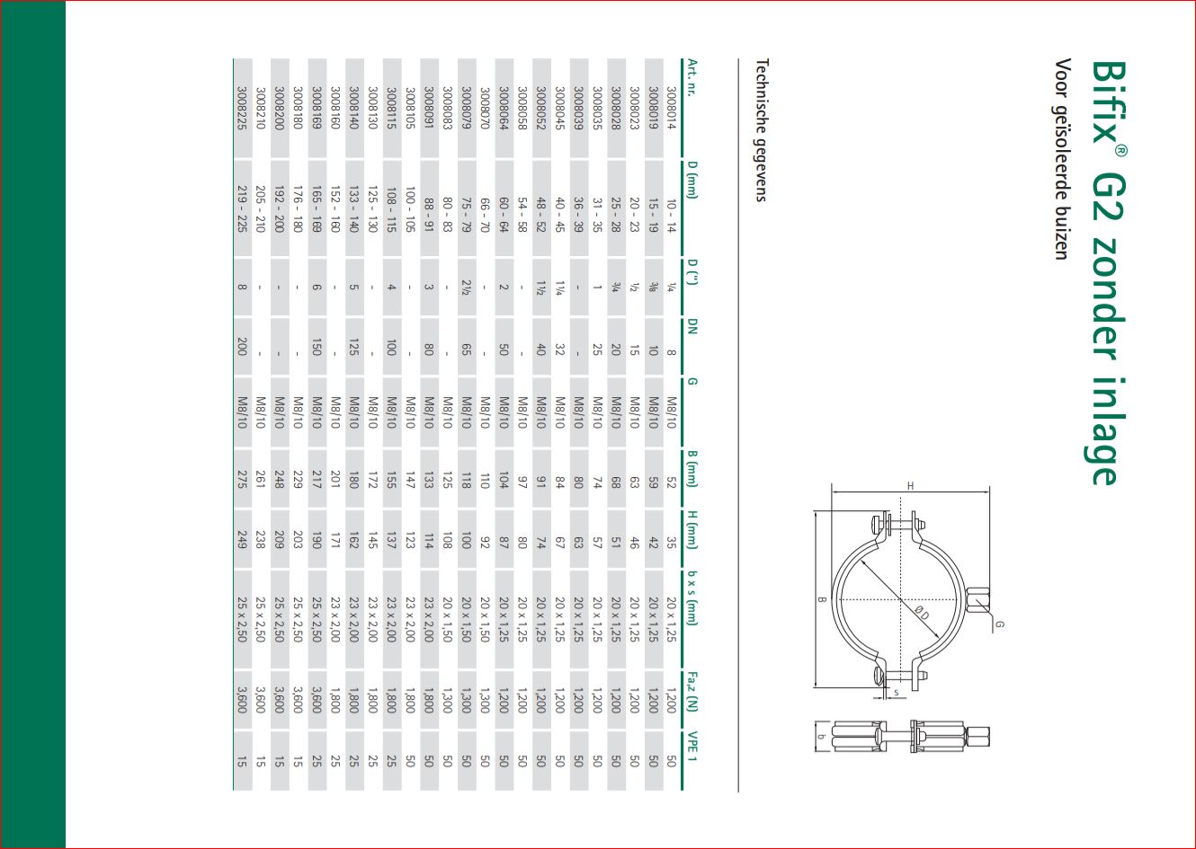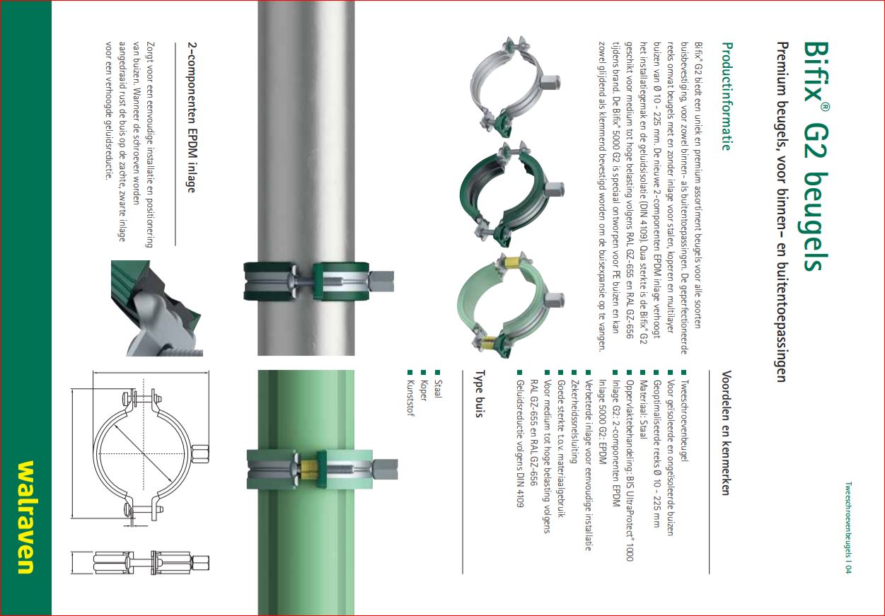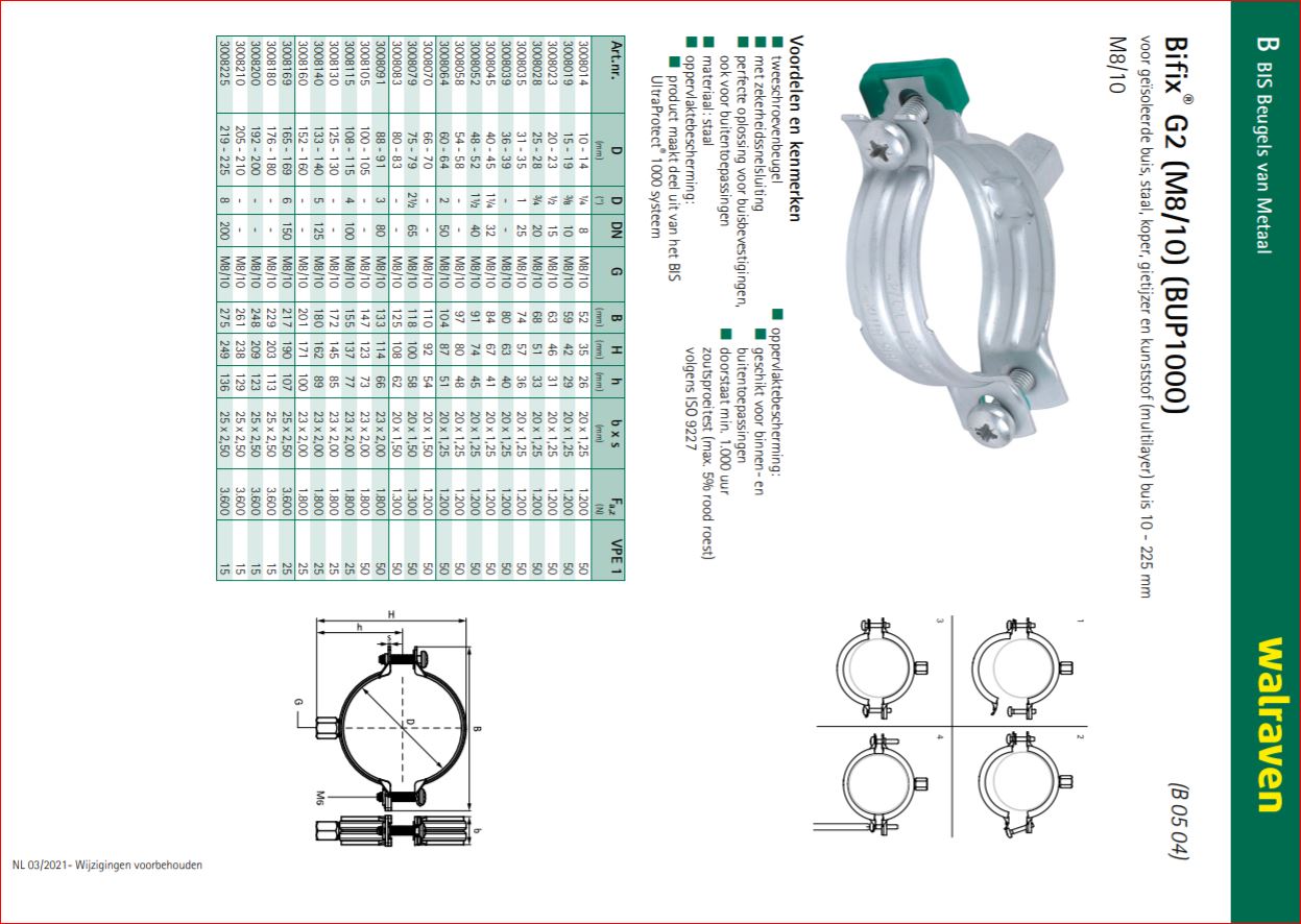 Voordelen en kenmerken: * Tweeschroevenbeugel * Voor geïsoleerde en ongeïsoleerde buizen * Geoptimaliseerde reeks Ø 10 – 225 mm * Materiaal: Staal * Oppervlaktebehandeling: BIS UltraProtect® 1000 * Inlage: 2-componenten EPDM * Verbeterde inlage voor eenvoudige installatie * Zekerheidssnelsluiting * Goede sterkte t.o.v. materiaalgebruik * Voor medium-hoge belasting volgens RAL GZ-655 en RAL GZ-656 * Geluidsreductie volgens DIN 4109 * Toepassing voor type's buis: - Staal - Koper - Kunststof (Bifix® 5000 G2)[/br]