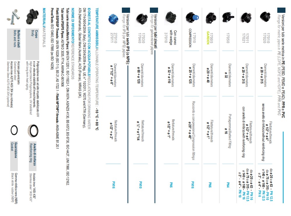 | Toepassing | Universeel aanboor/klemzadel passend op metrische (mm) PVC, PP, LDPE, MDPE, HDPE, Tyleenbuizen voor het aanboren van 90° aansluitingen op beregening, fertigatie, afvalwater, proceswater, koelwater leidingen |