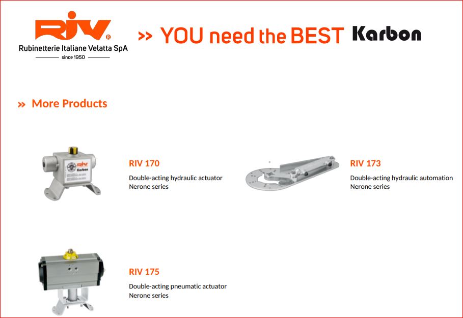 RIV levert een breed assortiment originele kwaliteit schuifafsluiters, hevel bediening armaturen, hydraulische- pneumatische enkel en dubbelwerkende cilinders, tank beveiligingen, tankvulling indicatoren, flexibele koppelingen en trechters.