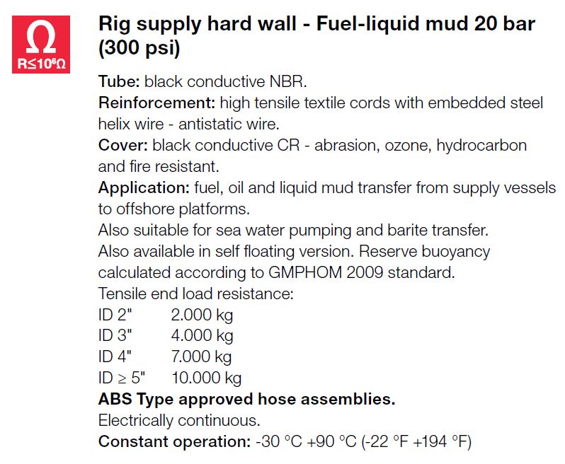 | Toepassing | Overdracht van brandstof, olie en modder van bevoorradingsschepen naar offshore-platforms. Geschikt voor zeewaterpompen en barietoverdracht. Ook verkrijgbaar in zelfzwevende versie. Reserve drijfvermogen berekend volgens GMPHOM 2009 standaard. |