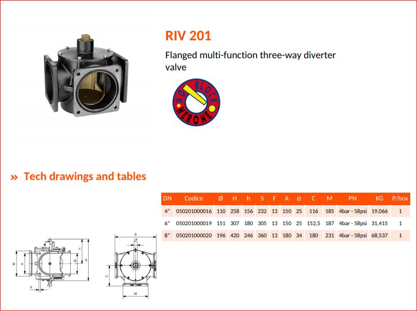 RIV Nerone 201 gietstalen 3- weg afsluiter met 3 vierkantflenzen 6" - 150 mm, incl. 3 O-ringen