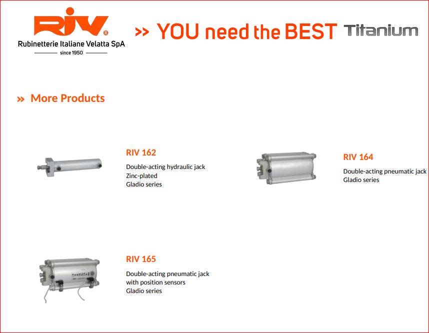 RIV levert een breed assortiment originele kwaliteit schuifafsluiters, hevel bediening armaturen, hydraulische- pneumatische enkel en dubbelwerkende cilinders, tank beveiligingen, tankvulling indicatoren, flexibele koppelingen en trechters.
