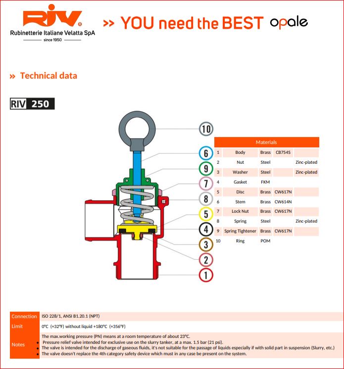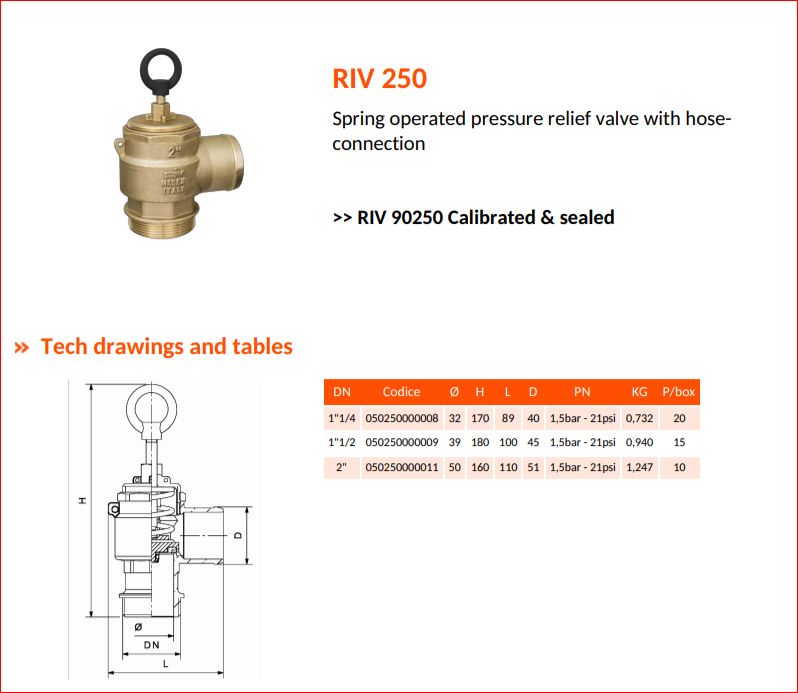 RIV Opale 250 gecallibreerd overdrukventiel voor mesttanken, 2" bu.dr. x 2" - 50 mm slangtule