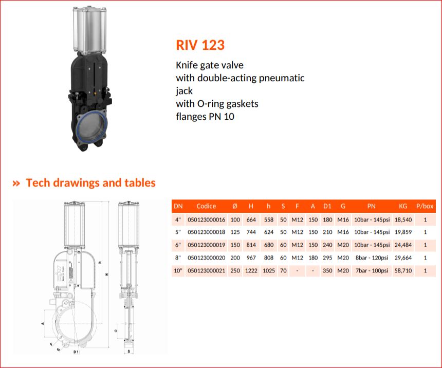 RIV Gladio 123 gietstalen / RVS 304 pneumatisch bediende plaatafsluiter met vierkantflenzen 4", incl. 2 O-ringen, ATEX, IMQ gecertificeerd