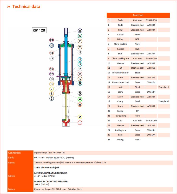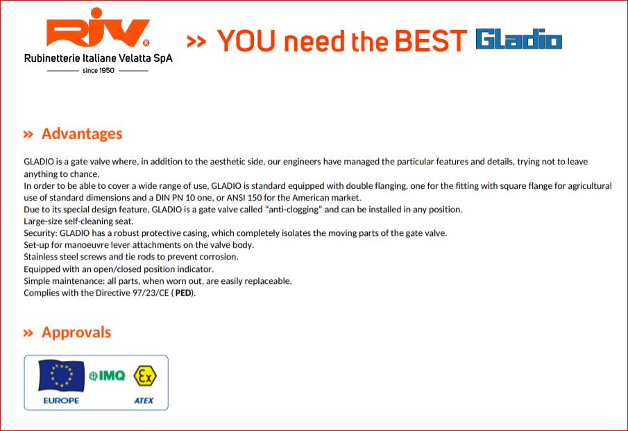 RIV levert een breed assortiment originele kwaliteit schuifafsluiters, hevel bediening armaturen, hydraulische- pneumatische enkel en dubbelwerkende cilinders, tank beveiligingen, tankvulling indicatoren, flexibele koppelingen en trechters.