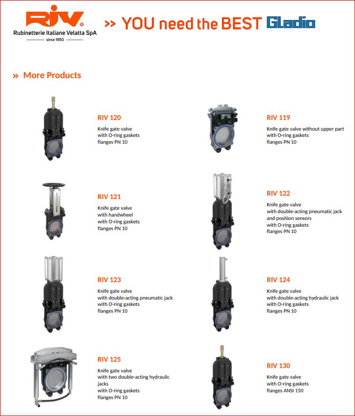 RIV levert een breed assortiment originele kwaliteit schuifafsluiters, hevel bediening armaturen, hydraulische- pneumatische enkel en dubbelwerkende cilinders, tank beveiligingen, tankvulling indicatoren, flexibele koppelingen en trechters.
