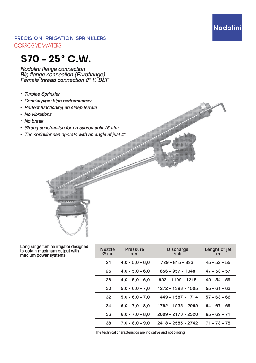 Nodolini professionele hogedruk sproeier voor agressief water type S70 - 25° C.W., sector 2 1/2" BSP-F bi. dr., incl. 8 nozzles