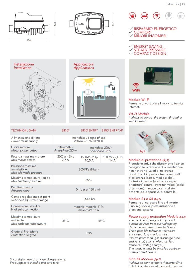 Italtecnica watergekoelde frequentie regelaar type Sirio Universeel 230VAC, 50Hz, 1 1/4" bu.dr., 1 x 230 VAC max. 10,5A, 3 x 230/400 VAC max. 9,7A, optioneel WIFI module