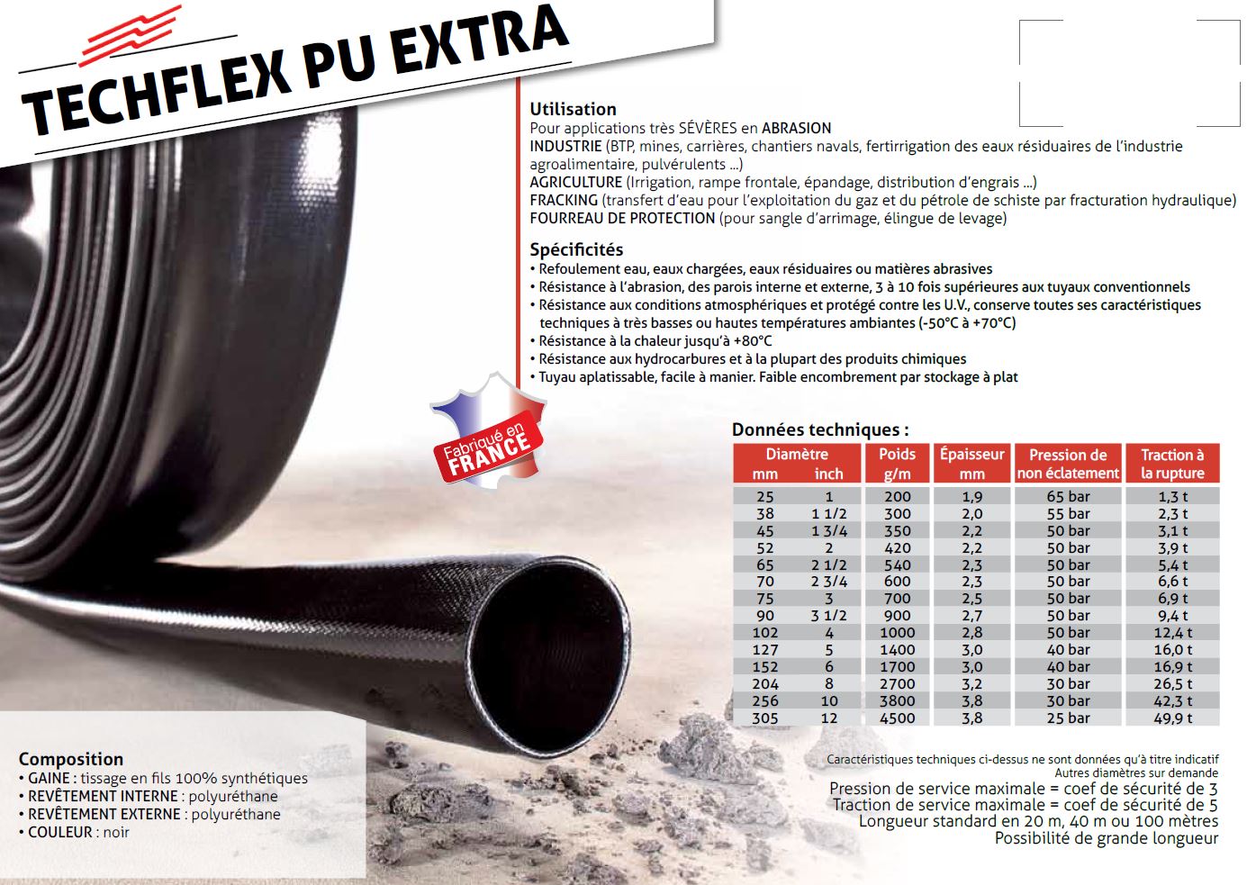Diameter 2 inch t/m 12 inch van binnen en buiten met polyurethaan bekleed met tussenliggend 100% synthetische polyesterweefsel ketting geweven jas met uitermate hoge treksterkte.[/br]