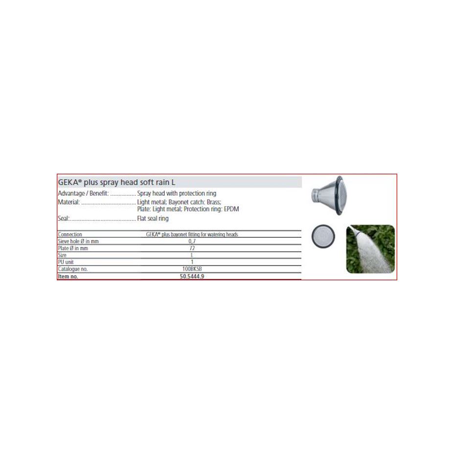 | Toepassing | Voor het bewateren van bloemen, planten, struiken, bomen, grasstroken of afkoelen van oppervlakten. Geka Plus Softrain (bajonetsluiting) en Geka Plus Classic componenten zijn onderling te combineren middels messing adapters. |