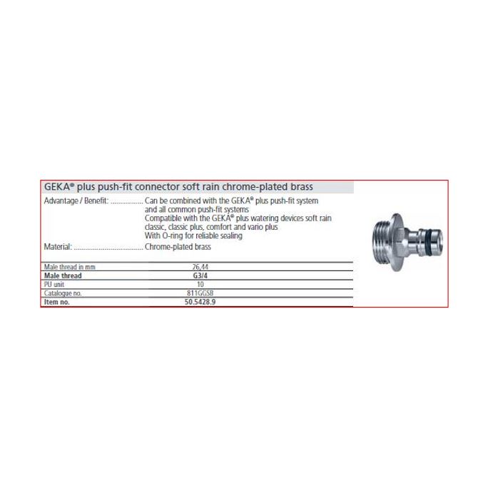 | Toepassing | Voor het bewateren van bloemen, planten, struiken, bomen, grasstroken of afkoelen van oppervlakten. Geka Plus Softrain (bajonetsluiting) en Geka Plus Classic componenten zijn onderling te combineren middels messing adapters. |
