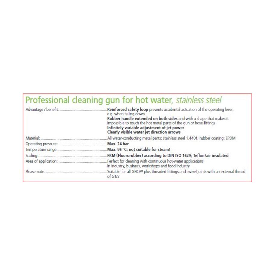 Geka prof. reiniging pistool, RVS constructie, cap. 25 l./min. - 5 bar, max. 24 bar, max. 95°C, 1/2" bi.dr.