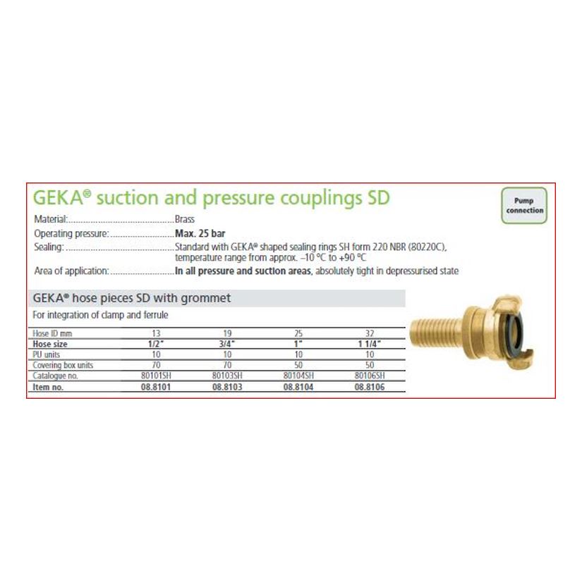 Originele messing Geka snelkoppeling, max. 25 bar, serie SD, (zuig - pers) met nastelbare slangtule 1/2"