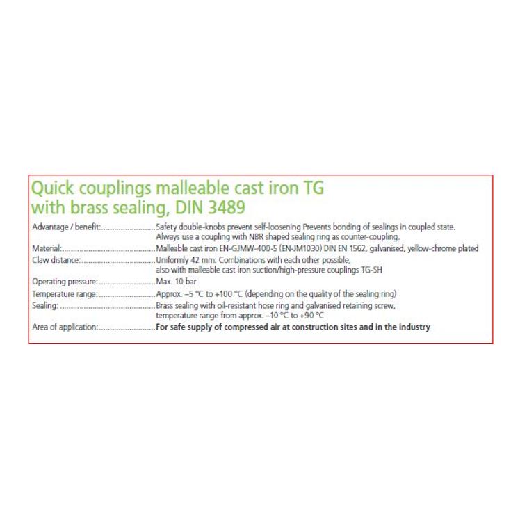 | Uitvoering | TG gietstalen, 10 bar snelkoppeling slangtule messing dichting |