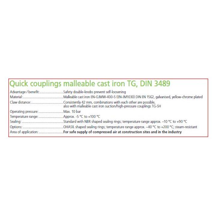 | Toepassing | Perslucht gereedschappen en installaties of fysiek zware gebruiksomstandigheden in bijv. bouw en baggerwerkzaamheden waar voor zowel perslucht als water een gietstalen koppeling gewenst is. |
