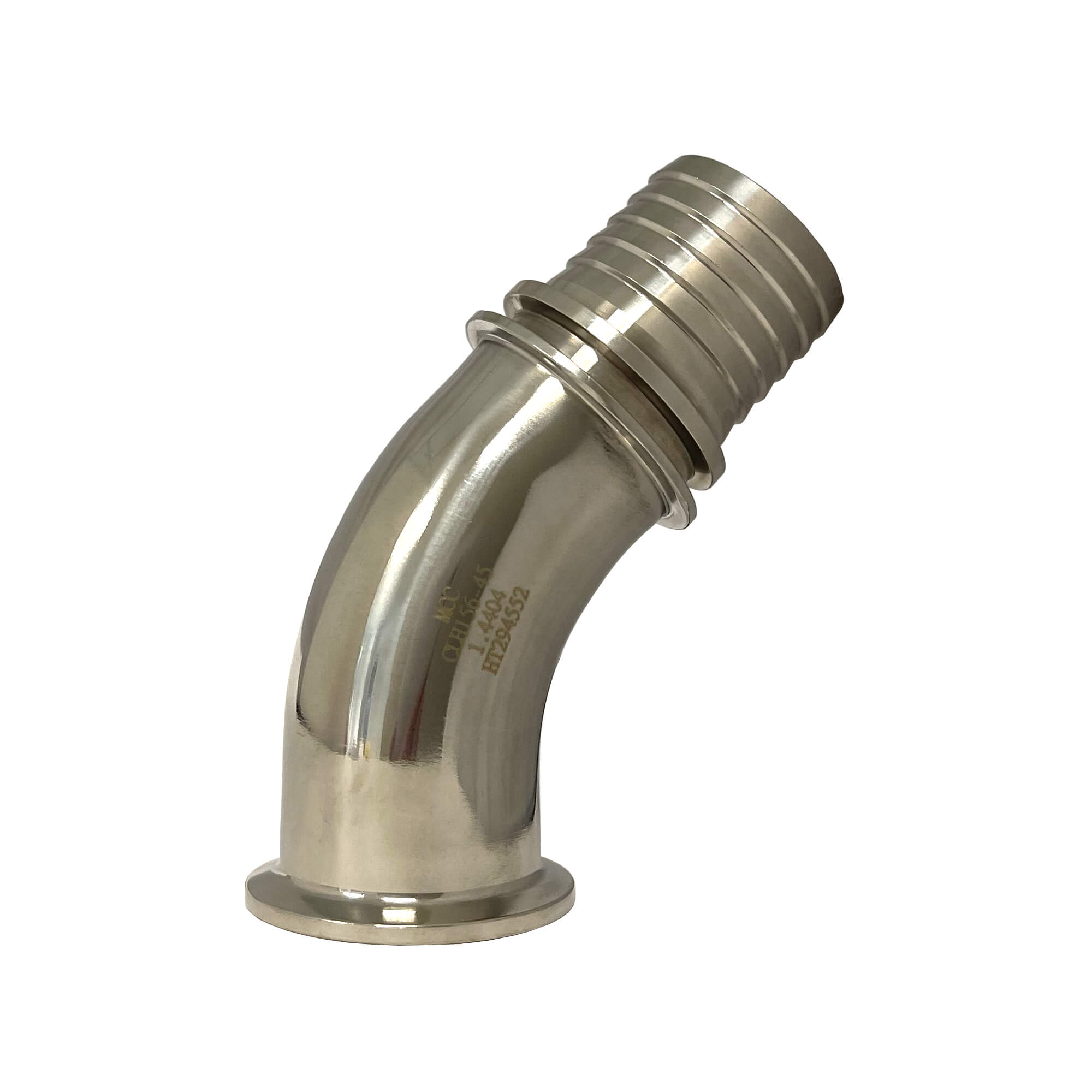 Tri-Clamp koppeling, RVS 316T, Bocht 45°, 64 x 50 mm, ferrule (Clamp) x gekartelde slangtule, toegepast in de voedingsmiddelen- en genotsindustrie, zuivelindustrie en chemische industrie, DIN 32676, 16 bar