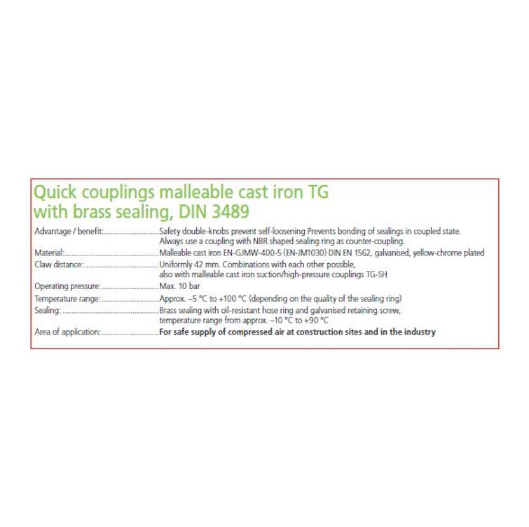 | Toepassing | Perslucht gereedschappen en installaties of fysiek zware gebruiksomstandigheden in bijv. bouw en baggerwerkzaamheden waar voor zowel perslucht als water een gietstalen koppeling gewenst is. |