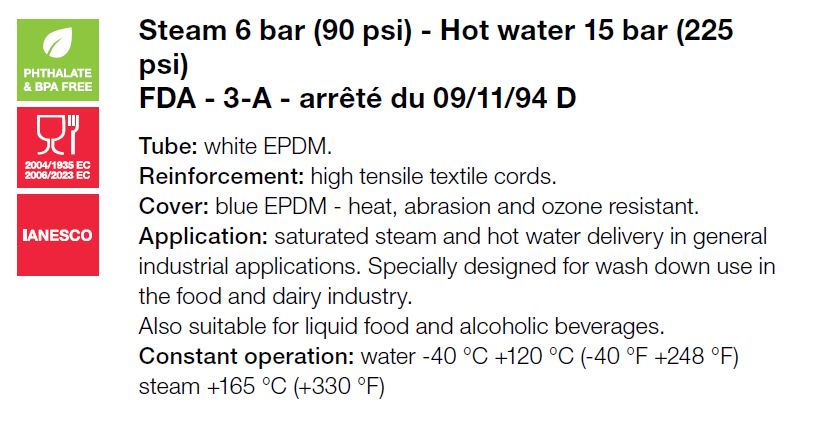 | Toepassing | Verzadigde stoom, heet water, speciaal ontworpen als wash-down slang in de voedingsindustrie. Eveneens inzetbaar bij levensmiddelen en alcohol |
