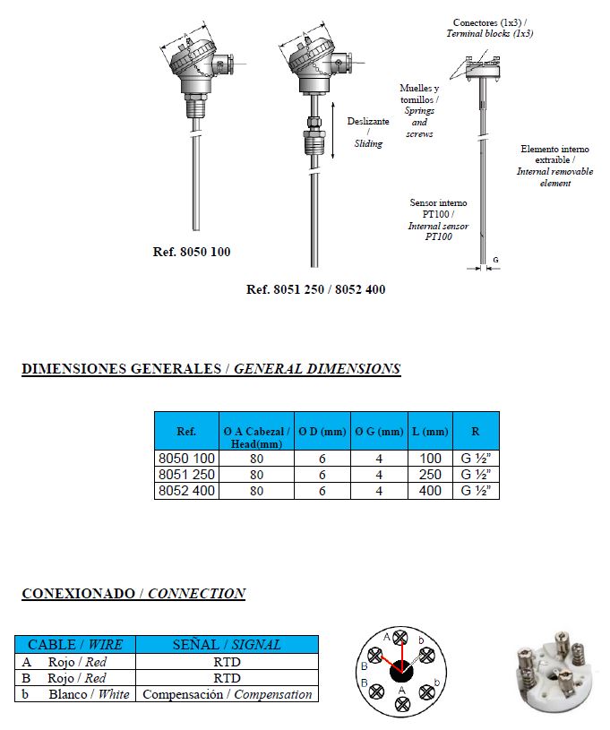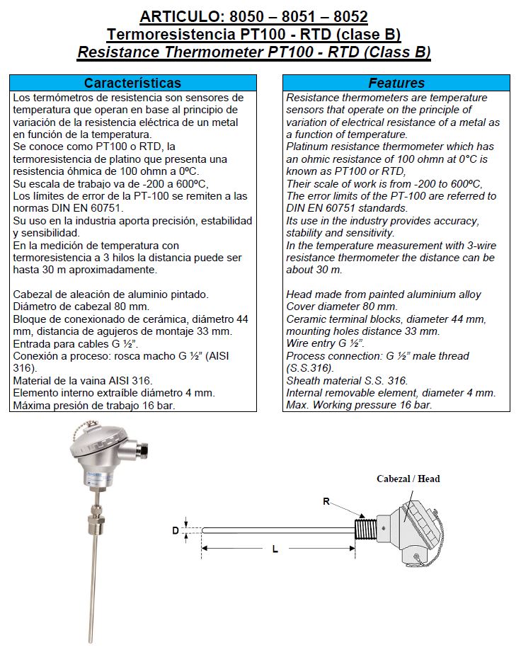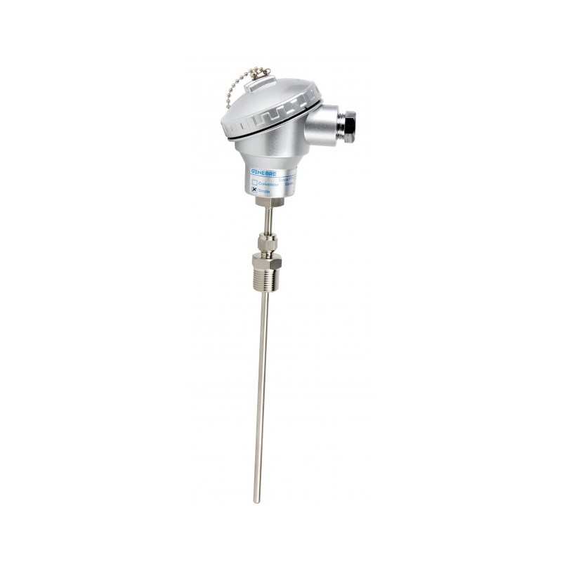 Genebre temperatuur sensor PT100, RVS 316 behuizing, type 8050, RVS voeler L = 100 mm, 1/2" RVS bu. dr., -200 - 850 °C, onderaansluiting, niet conisch dichtend, conform DIN en 60751, keramisch aansluitblok, 3 draden