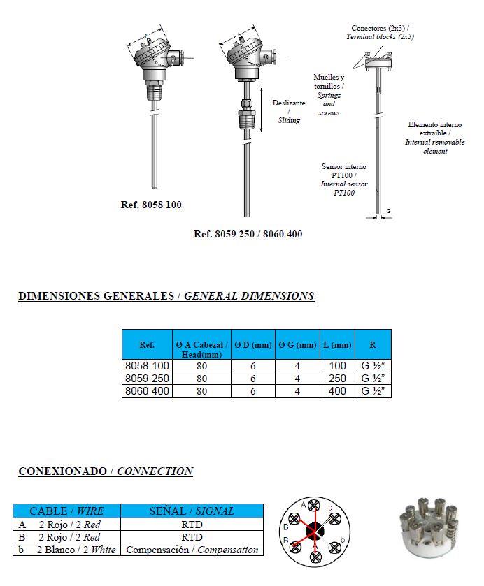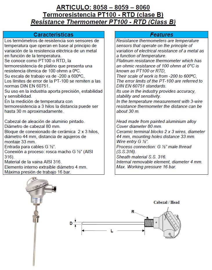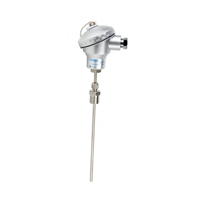 Genebre temperatuur sensor PT100, RVS 316 behuizing, type 8060, RVS voeler L = 400 mm, 1/2" RVS bu. dr., -200 - 850 °C, onderaansluiting, niet conisch dichtend, conform DIN en 60751, keramisch aansluitblok, 2 x 3 draden