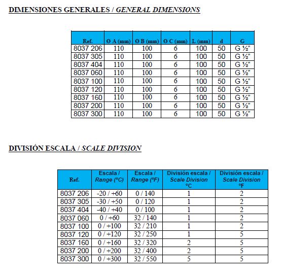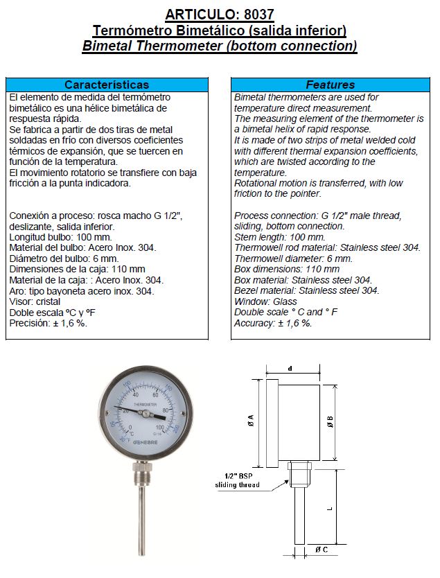 Genebre bimetaal thermometer, RVS 304 behuizing, diam. 100 mm, type 8037, RVS voeler L = 100 mm met diam. 8 mm, 1/2" RVS bu. dr., 0 - 300 °C, onderaansluiting, niet conisch dichtend, °C & °F aanduiding
