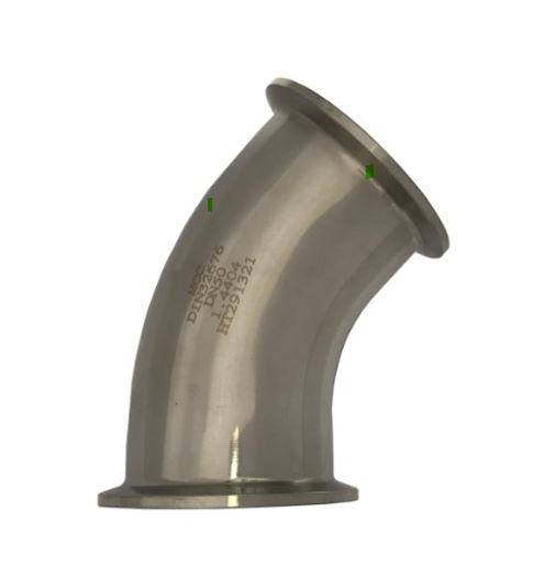 Tri-Clamp koppeling, RVS 316T, Bocht 45°, 20 x 34 mm, 2 x Clamp (klem) aansluiting, toegepast in de voedingsmiddelen- en genotsindustrie, zuivelindustrie en chemische industrie, DIN 32676, 16 bar