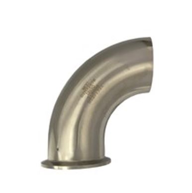 Tri-Clamp koppeling, RVS 316T, Bocht 90°, 80 x 106 mm, ferrule (Clamp) x lasaansluiting, toegepast in de voedingsmiddelen- en genotsindustrie, zuivelindustrie en chemische industrie, DIN 32676, 16 bar