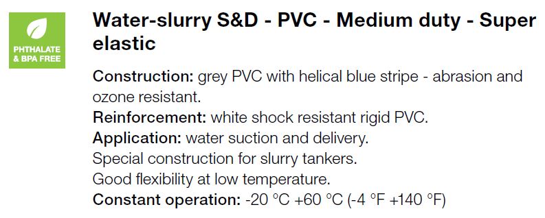 | Toepassing | Zuig -en persslang voor water. Speciale constructie voor tankwagens . Blijft soepel bij lage temperaturen |