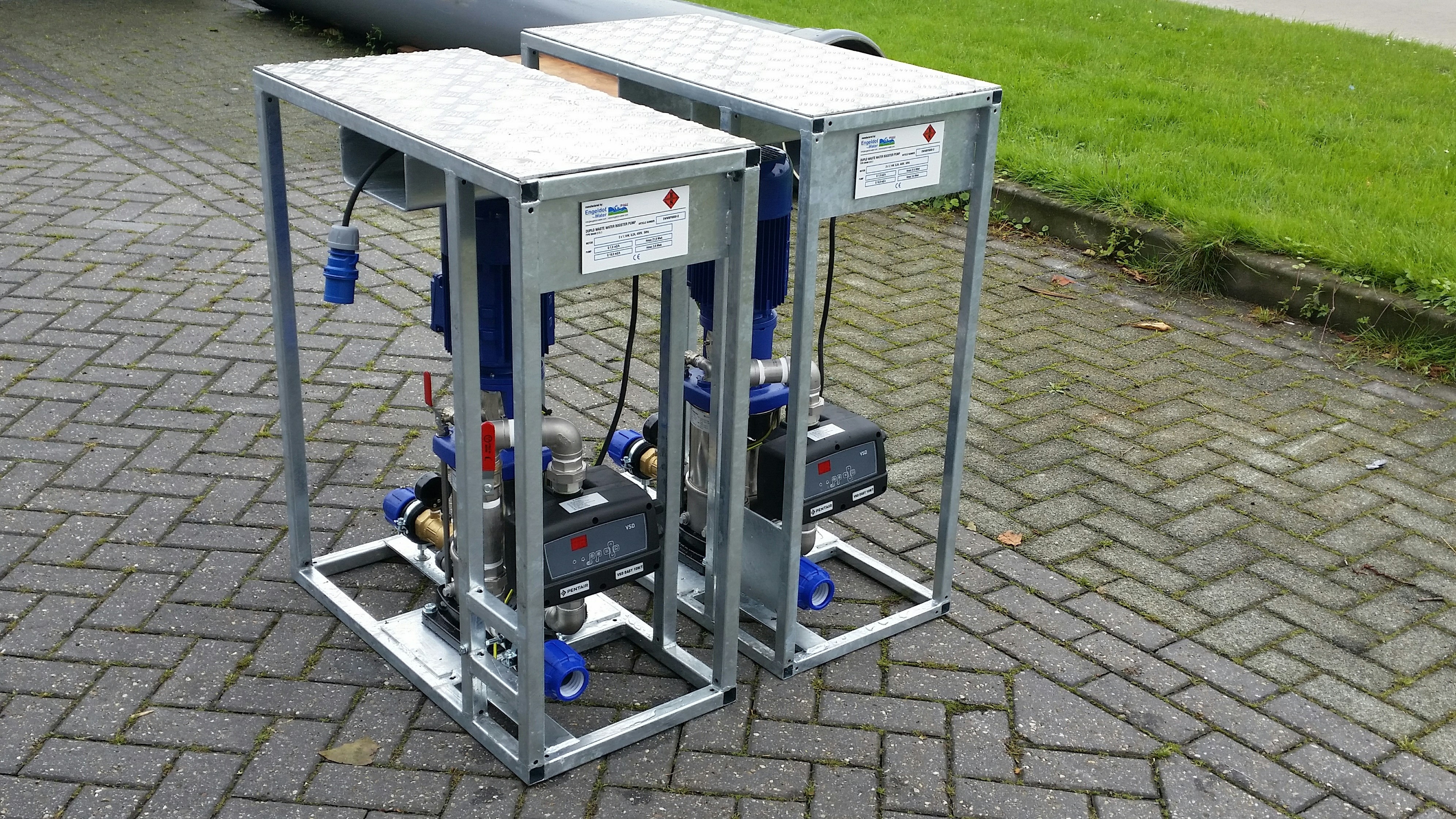 Engeldot-Water evenementen drinkwater pompsysteem type DPV-VS 10-6M-T. Unieke, duurzame en bewezen betrouwbare pompsysteem voor toepassing op kleine en grootschalige evenementen, horeca, beurzen, industrie, bouwplaatsen ect., meer dan 1.200 systemen geleverd voor diverse evenementen. Het pompsysteem is specifiek ontworpen om drinkwater te verpompen vanuit een tussenopslag naar verbruikers zoals sanitaire en horeca voorzieningen. De pomp is voorzien van een frequentieregelaar met Wifi module om op afstand de pomp te bedienen. Voeding 1 x 230VAC, aansturing pompmotor 3 x 230VAC. Het pompsysteem is d.m.v. de frequentieregelaar traploos instelbaar in debiet / systeemdruk en stuurt automatisch bij een grotere of geringere debiet vraag. Bij geen afname of geen watertoevoer stopt de pomp automatisch met draaien, waarmee de pomp wordt beveiligd tegen droog en warmdraaien. Het systeem wordt Plug & Play geleverd in robuust stapelbaar stalen frame incl. multifunctionele besturing. SCHOON WATER POMPSYSTEEM VOOR INDUSTRIE EN EVENEMENTEN, BESTAANDE UIT: - Volbad verzinkt stalen frame - Frame afmeting ca. L = 800 x B = 400 x H = 930 mm - Normaalzuigende RVS 316 verticale meertrapspomp met 6 waaiers - Cap. min. 2,0 m3/h - 67 Mwk - Cap. max. 12 m3/h - 35 Mwk - Controleerbare messing terugstroombeveiliging, KIWA keurmerk - Membraandruktank 2 ltr. - RVS 316 persleiding - Aansluitingen: Irritec PE klemfittingen 40mm, DVGW / WRAS keurmerk - Compleet gemonteerd en getest - 12 maanden fabrieksgarantie - CEE conformiteitverklaring - Typeplaat met naam producent en klant - Motor 2,2kW, 3 fasen 230 / 400VAC, 4,8A, 50Hz - 3 meter aansluitsnoer met CEE contactstop 3-polig 16A, IP54 Besturing: - Sirio Wifi frequentieregeling - Met droogloopbeveiliging - Max. stroombeveiliging - Gewenste systeem druk is eenvoudig in te stellen en visueel zichtbaar - Automatische storing reset