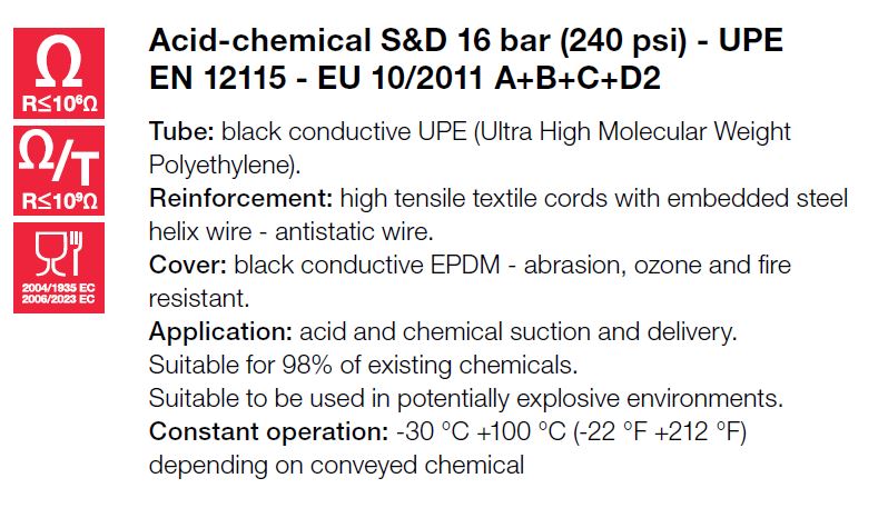 | Toepassing | Zuig-en persslang voor, Geschikt voor 98% van de bestaande chemicaliën. Inzetbaar in explosiegevoelige omgevingen |
